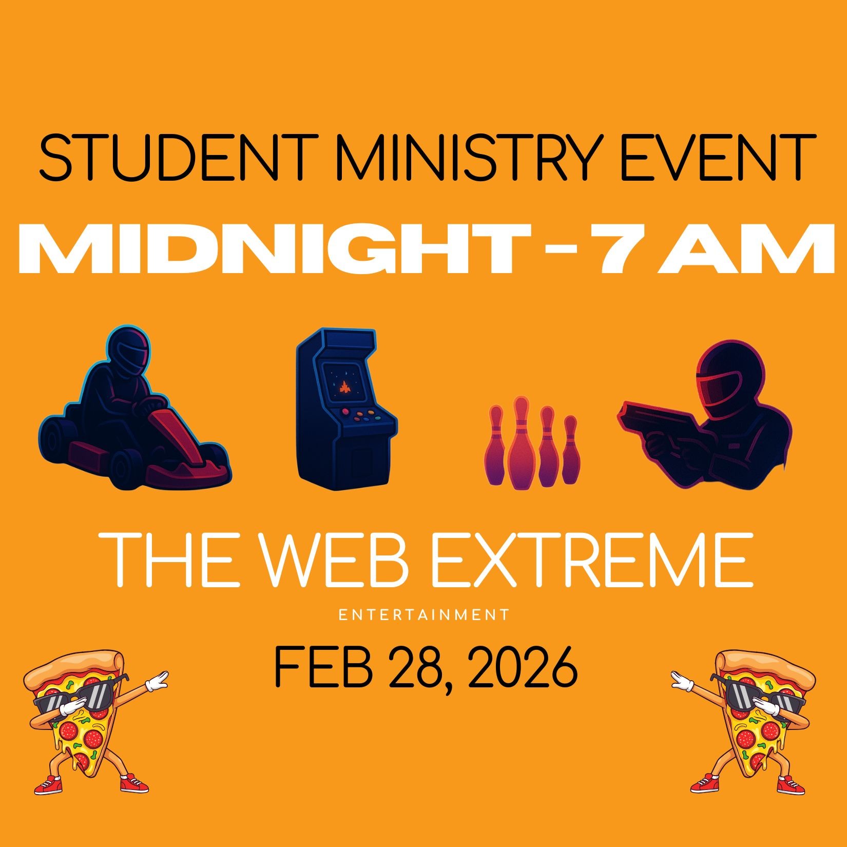 Student Ministry Lock-in | Register Details: Join us January 23, at The WEB Extreme Entertainment. Drop off is Friday night 11:30PM pick up is Saturday morning 6:00am. Students will enjoy laser tag, bowling, go karting, putt putt golf, and arcade games, plus, PIZZA and drinks! Cost is $35 per student. . Location: The Web Extreme