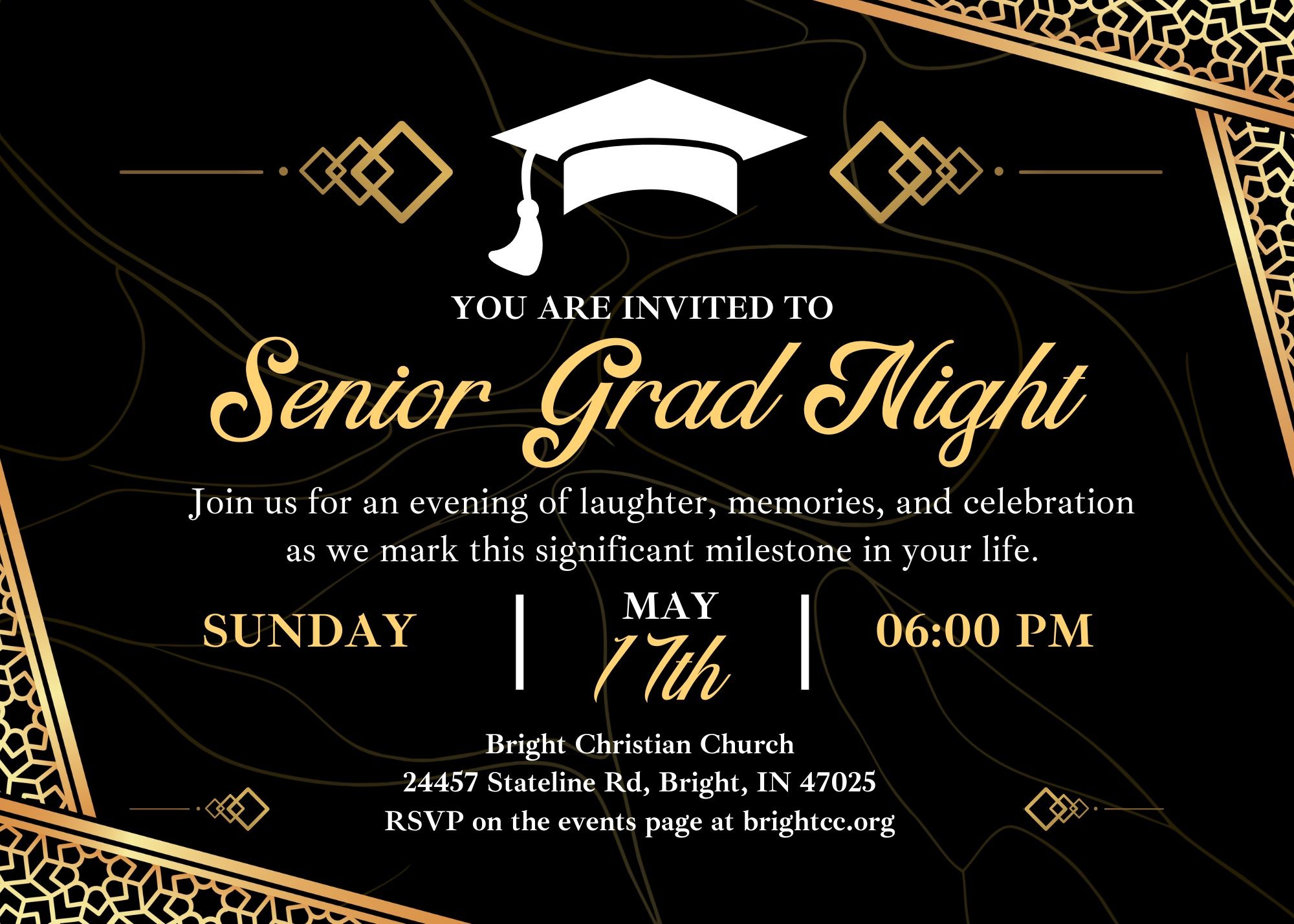 Senior Grad Night May 17 | 06:00 PM Register Details: Join us for Senior Grad Night as we celebrate all graduating high school seniors and their families! This special evening is a time to honor our seniors, reflect on their accomplishments, and pray over the next chapter of their lives. Please RSVP no later than May 13 to help us prepare. If you have any questions, feel free to reach out to Bennett Noble or Kayla Griffin—we’d be happy to help. We look forward to celebrating this exciting milestone with you!This event is for Senior Student and their family only. . Location: Fellowship Hall